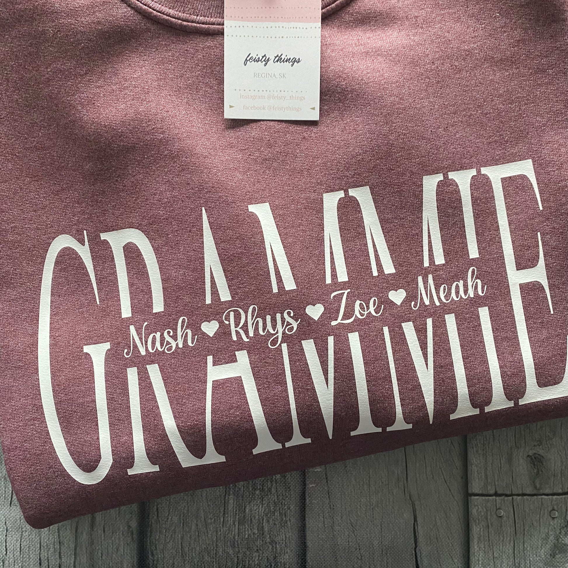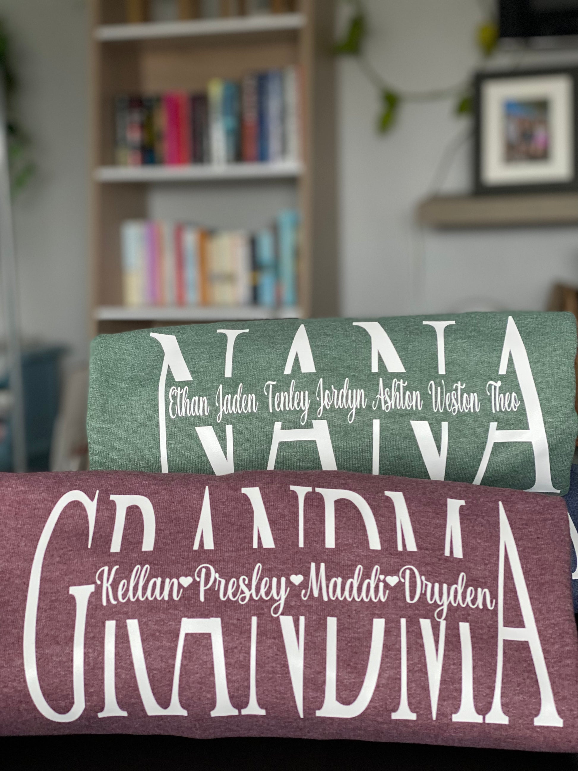 One of our best-loved designs featuring the special title for her, and all the kids or grandkids names within! There is no limit to the number of names. We also have a hoodie version here!