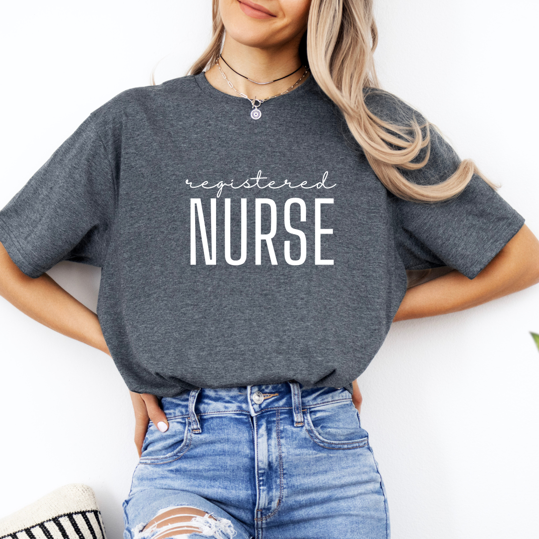 Our Registered Nurse unisex tees feature a small design on the upper left corner that is simple yet timeless. Choose from 8 colors to add a must-have item to your work wardrobe. The black and white options are 100% cotton and our heathered options offer a 60/40 polyester/cotton blend.