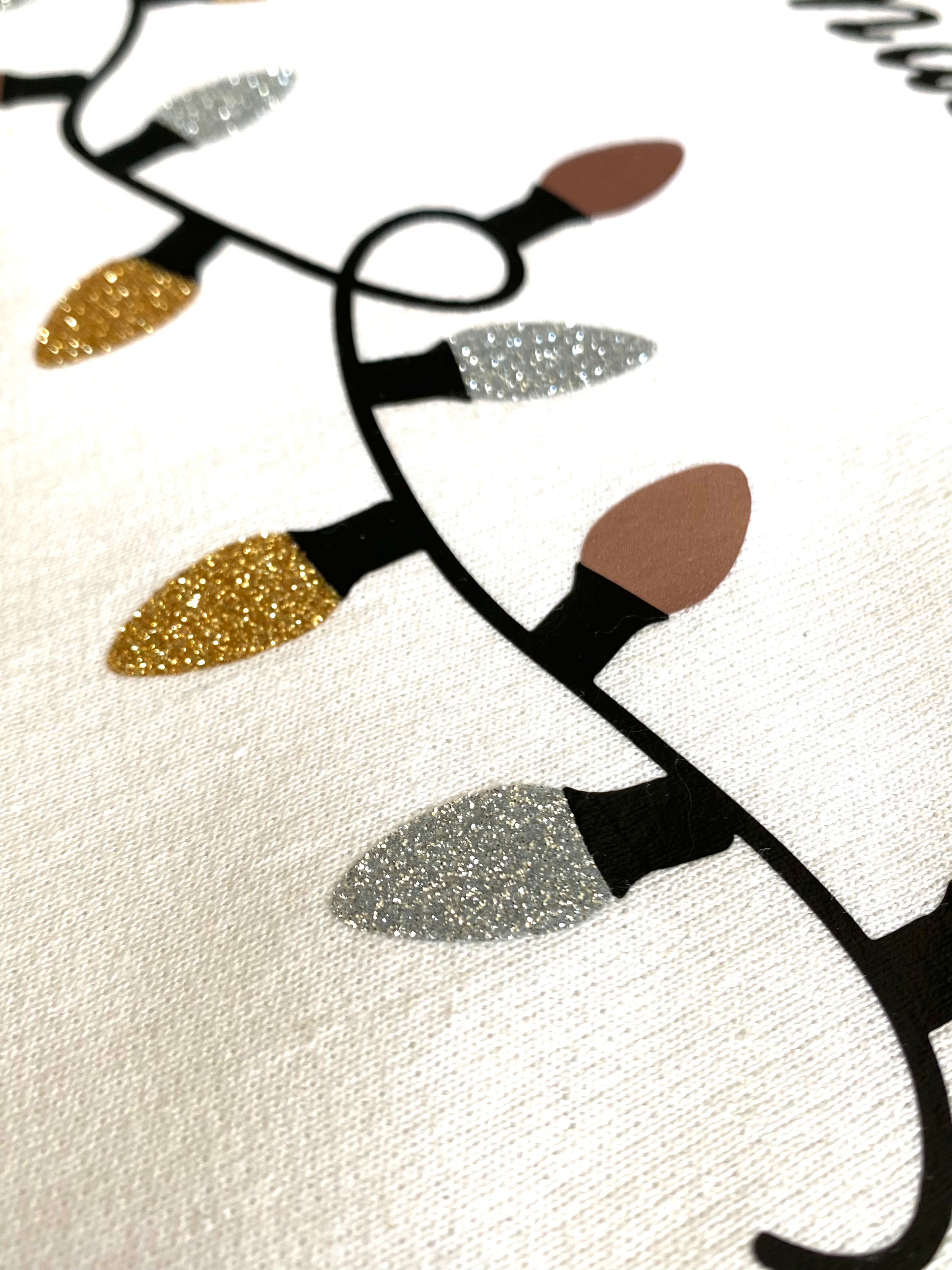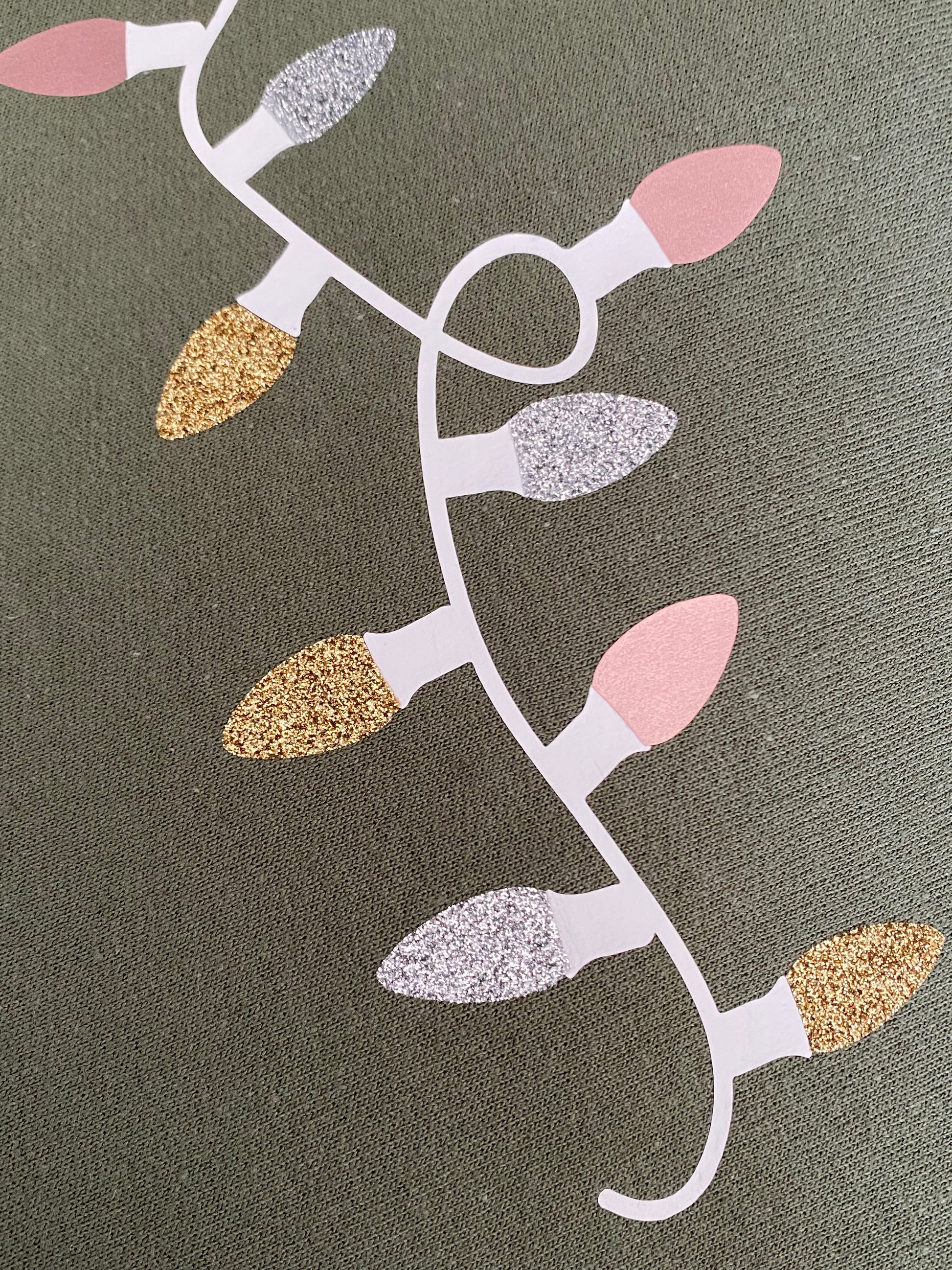 We have been making this shirt for the past few holiday seasons and it's always a hit! We match the holiday ornaments to compliment the color of the shirt, so each one is unique. We use glitter silver, glitter gold, glitter black, then mix in rose gold, gold and silver to showcase the prettiest lights.